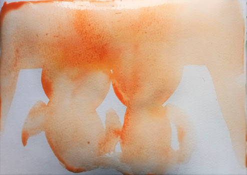 · Into that wash, blend, paint, drop one of the other of your colour mixes (I used the Cerulean Blue ~ Cadmium Red mix. I then dropped more bright orange mix into it, Cadmium Red ~ Cadmium Yellow).