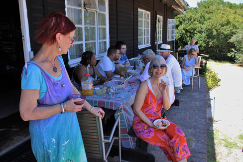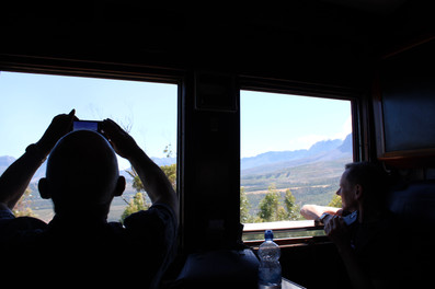 We've been on a steam train ride from Cape Town to a small place called Elgin, we passed through areas of deep poverty and through smart gated communities. The townships got me musing in my mind (as ever) and wondering if we mightn't have townships ourselves one day as housing becomes increasingly unaffordable and unavailable. We chugged through big open countryside, lots of vineyards, apple and pear orchards, some cattle, and in the poorest areas, pigs, goats, chickens, and then we climbed right up through a mountain pass and could see the cart tracks made by earlier settlers. The whole trip was a full day's travel with a lunch stop in the middle. It was awe inspiring to travel through such vast landscapes. The train was called 'Clare'!